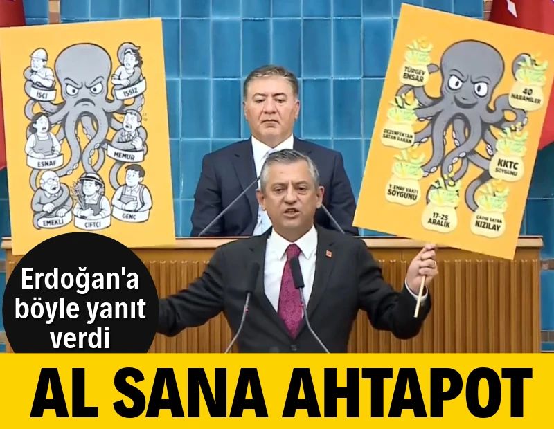 Ana muhalefet lideri, partisinin bugün Türkiye Büyük Millet Meclisi’nde (TBMM) düzenlenen grup toplantısında AKP'li Fatih, Bayrampaşa ve Bahçelievler Belediyeleri'nde Sayıştay tarafından tespit edilen usulsüzlükleri anlatıp "Sıra Esenler'de" dedikten sonra "Al sana ahtapot" diyerek bir ahtapot kaldırdı:
