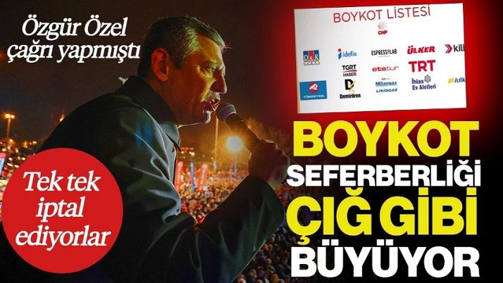 Özgür Özel’in çağrısıyla boykot edilmesi istenen şirketler şöyle: EspressoLab, D&R, İdefix, Demirören AVM, Kilim Mobilya, Ülker, Türk Petrol, Milangaz, Likitgaz, TRT, TGRT, İhlas Ev Aletleri, Turkuvaz Yayınevi, Milli Piyango, misli.com, iddia.com, ETS Tur.