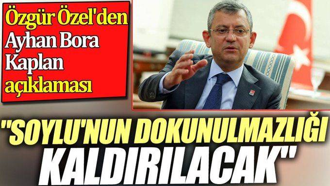 Özgür Özel, Ayhan Bora Kaplan soruşturması hakkında önemli açıklamalarda bulundu. Özel, Ayhan Bora Kaplan soruşturmasında gizli öznelerden birinin Süleyman Soylu olduğunu ifade ederek, Soylu’nun dokunulmazlığının kaldırılıp yargı önünde bildiklerini anlatması gerektiğini ifade etti.