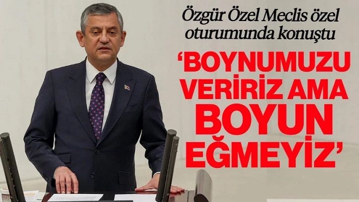 Genel Kurula hitap eden Cumhuriyet Halk Partisi Lideri Özel, “Sayın Başkan, Sayın Cumhurbaşkanı Yardımcısı, Sayın Genel Başkanlar, Sayın Grup Başkanları ve yüksek yargının değerli başkanları, Meclisimizin önceki dönem başkanları, değerli büyükelçiler, değerli büyükelçi vekilleri, değerli konuklar, ekranları başında bizi izleyen kıymetli vatandaşlarımız, hepinizi Türkiye Cumhuriyeti’ni kuran, ülkemizi demokrasiye, çok partili siyasi hayatla buluşturan, 103 yıllık tarihi ile dünyanın en köklü partilerinden olan, Gazi Mustafa Kemal Atatürk’ün kurduğu Cumhuriyet Halk Partisi’nin Genel Başkanı olarak en derin saygı ve sevgilerimle selamlıyorum. 23 Nisan Ulusal Egemenlik ve Çocuk Bayramımız kutlu olsun” dedi.