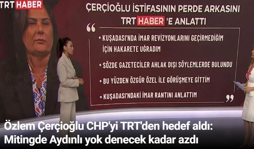 CHP'den seçilmesine rağmen geçtiğimiz günlerde AKP'ye katılma kararı alarak tepki toplayan Aydın Büyükşehir Belediye Başkanı Özlem Çerçioğlu, CHP'yi ve Genel Başkan Özgür Özel'i iktidara yakın politikasıyla bilinen TRT Haber'e yaptığı açıklama ile hedef aldı. Çerçioğlu, CHP'nin Aydın'da gerçekleştirdiği mitingle ilgili de sessizliğini bozdu.