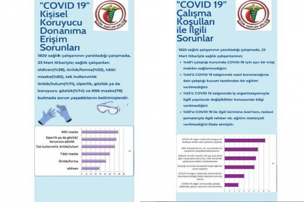 Bu çalışmaya yanıt veren 74 ilden 1820 sağlık çalışanının %70’i çalıştığı sağlık kurumunda birden fazla COVID19 hastası olduğunu, %6’sı bir sağlık kurumunda teyitli COVID19 hastasıyla yüz yüze (1 metre mesafede) teması olduğunu belirtmiştir.