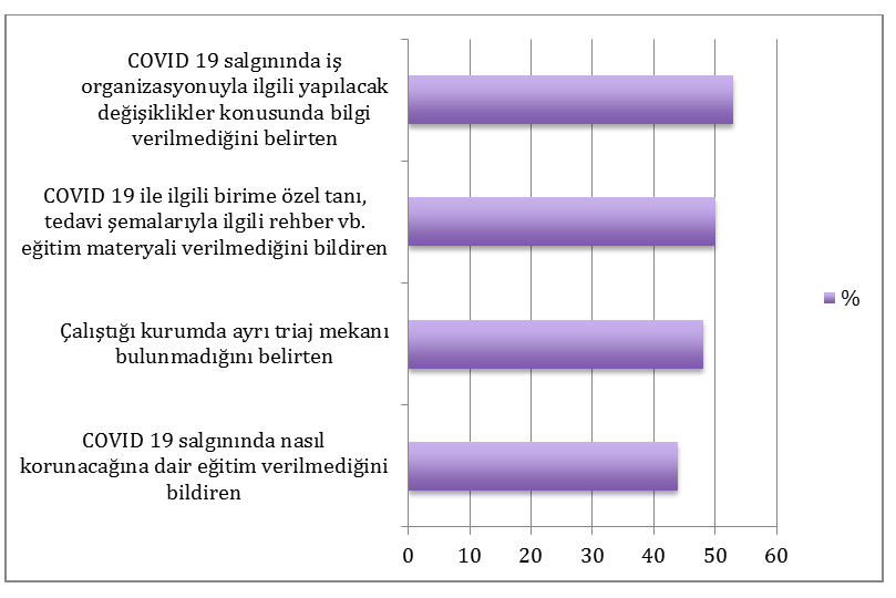 Yanıt verenlerin %48’i çalıştığı kurumda COVID19 için ayrı bir triaj mekânı sağlanmadığını, %44’ü COVID 19 salgınında nasıl korunacağına dair çalıştığı kurum tarafından bir eğitim verilmediğini, %53’ü COVID 19 salgınında iş organizasyonuyla ilgili yapılacak değişiklikler konusunda bilgi verilmediğini, %50’si COVID 19 ile ilgili birimine özel tanı, tedavi şemalarıyla ilgili rehber vb. eğitim materyali verilmediğini ifade etmiştir.