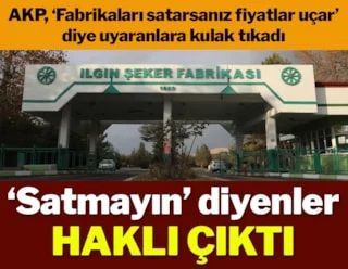 Dönemin Başbakanı, bugünün Cumhurbaşkanı Tayyip Erdoğan ve partisi tüm itirazlara kulak tıkayarak bu fabrikaları sattı. Bunun sonucunda bugün vatandaş şekerin kilogramına markette 4550 TL ödemek zorunda kaldı.