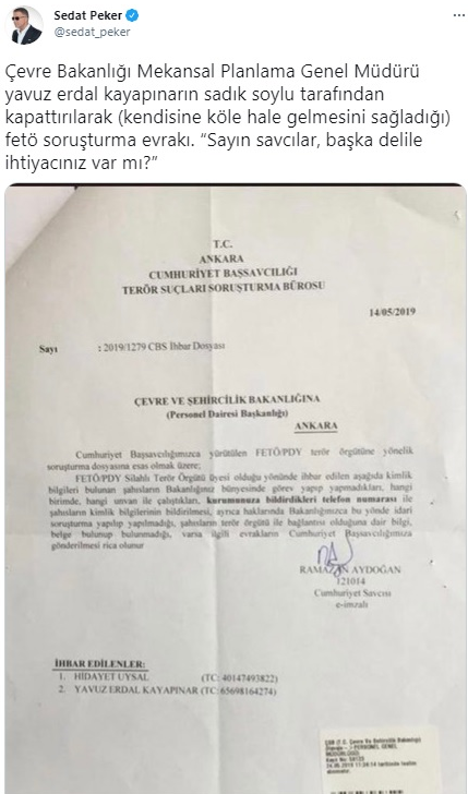 "Çevre Bakanlığı Mekansal Planlama Genel Müdürü yavuz erdal kayapınarın sadık soylu tarafından kapattırılarak (kendisine köle hale gelmesini sağladığı) fetö soruşturma evrakı. “Sayın savcılar, başka delile ihtiyacınız var mı?”