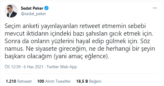 Peker, 'Seçim anketi yayınlayanları retweet etmemin sebebi mevcut iktidarın içindeki bazı şahısları gıcık etmek için. Sonra da onların yüzlerini hayal edip gülmek için. Söz namus. Ne siyasete gireceğim, ne de herhangi bir şeyin başkanı olacağım (yani amaç eğlence).' dedi.