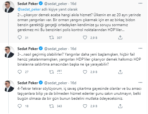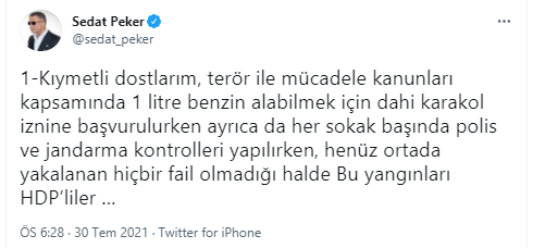 Peker, "Bu yangınları HDP’liler çıkarıyor demek acaba hangi akıla hizmet? Ülkenin en az 20 ayrı yerinde orman yangınları var. Bir orman yangını çıkarmak için en az birkaç bidon benzin gerektiği gerçeği ortadayken kendimize şu soruyu sormamız gerekmez mi: Bu benzinleri polis kontrol noktalarından HDP’liler…nasıl geçirmiş olabilirler? Yangınlar daha yeni başlamışken, hiçbir fail henüz yakalanmamışken, yangınları HDP’liler çıkarıyor demek halkımızı HDP binalarına saldırtma amacından başka ne işe yarayabilir?" ifadelerini kullandı.