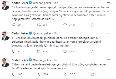 5Ülkemizi gerçekten seven gerçek milliyetçiler, gerçek vatanseverler; her ne olursa olsun lütfen sokağa çıkmayın. Vatansever görünümlü provokatörlerin oyununa asla gelmeyin Benim samimiyetime ve tecrübeme lütfen inanın. Sağlığıma kavuşmama az kaldı,…
