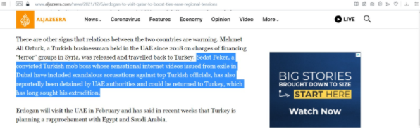 Haberde "hüküm giymiş Türk Mafya Babası Sedat Peker'in BAE yetkilileri tarafından gözaltına alındığı" bildirilmişti. Al Jazeera haberin bu kısmını doğrulayamadığı için bu cümleler haberden kaldırıldı.