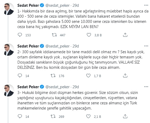 Organize suç örgütü lideri Sedat Peker, hakkında ağırlaştırılmış müebbet hapis istemiyle dava açılmasını yorumladı.