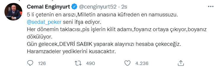"5 li çetenin en arsızı, Milletin anasına küfreden en namussuzu. @sedat_peker seni ifşa ediyor.