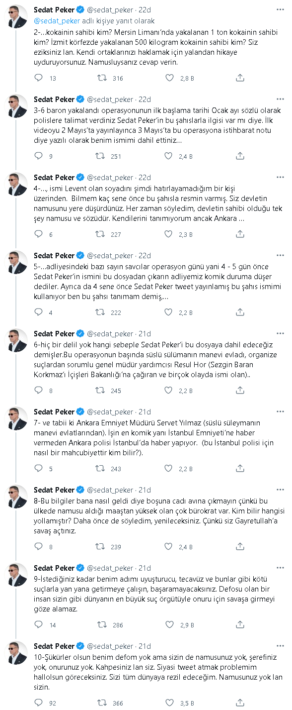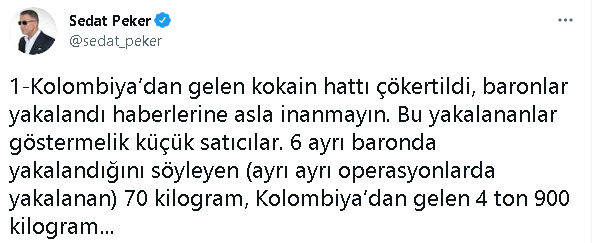 Organize suç örgütü lideri Sedat Peker, sosyal medya hesabından yaptığı paylaşımda, son günlerde ortaya çıkan 'KolombiyaTürkiye hattındaki uyuşturucu baronları' ile ilgili çıkan haberlerin 'göz boyama' olduğunu söyledi.