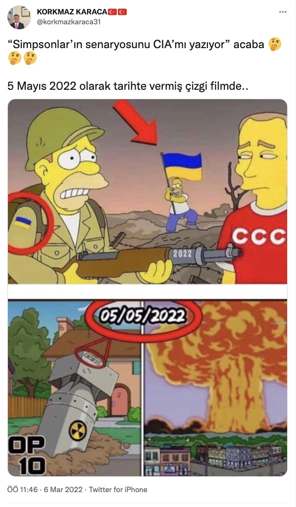 • Nükleer füzenin stok görsel olduğu, The Simpsons’tan bir kareye eklendiği ve üzerine tarih atıldığı anlaşılıyor.