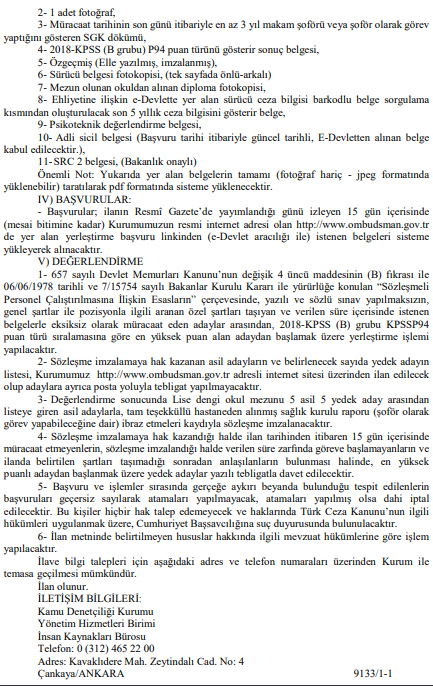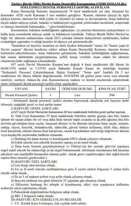 TBMM Kamu Denetçiliği Kurumu, sözleşmeli şoför alımı için ilan verdi. Resmi Gazete’de yayımlanan ilanda önce kurumun “İnsanların en hayırlısı insanlara en fazla faydası dokunandır” inancını ve “İnsanı yaşat ki devlet yaşasın” ilkesini kendisine rehber edindiği bildirildi.