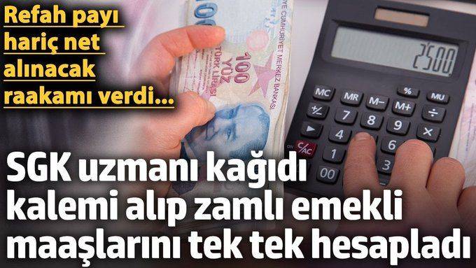 SGK Uzmanı İsa Karakaş, Türkiye gazetesindeki “Emeklilerin zammına son bir adım kala muhtemel güncelleme” başlıklı yazısında emeklilere gelecek zamlı maaşı ‘refah payı’ hariç şeklinde hesapladı. Karakaş, “Kök maaşı 15.400 TL olan SSK veya BağKur emeklisi kasım ayı enflasyon verisi ile refah payı verilmese dahi bugün itibarıyla maaşı en az 17 bin 645 TL’ye yükselmiştir. Başka bir örnek olarak kök maaşı 11.000 TL olan bir emeklinin aynı şekilde kasım ayı enflasyon verisi ile refah payı verilmezse dahi bugün itibarıyla 12 bin 604 TL maaşa hak kazanmaktadır.” ifadelerini kullandı.
