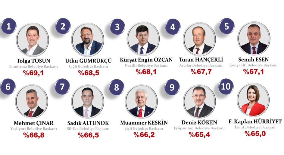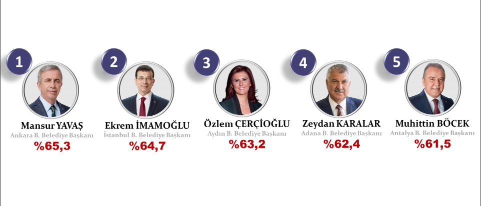 Ankara Büyükşehir Belediye Başkanı Mansur Yavaş, % 65.3 ile en başarılı belediye başkanı olurken, onu İstanbul Büyükşehir Belediye (İBB) Başkanı Ekrem İmamoğlu ve Aydın Büyükşehir Belediye Başkanı Özlem Çerçioğlu takip etti.