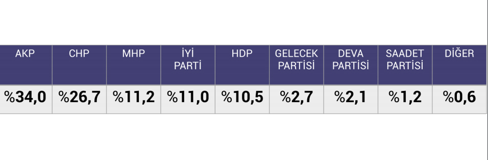 "Bu pazar seçim olsa hangi partiye oy verirsiniz?" anketinden de sürpriz sonuçlar çıktı. AKP'nin oylarının % 34'e kadar gerilediği dikkat çekerken CHP'nin oy oranı % 26.7 oldu. Anket sonucuna göre barajı 5 parti geçerek Meclise giriyor.