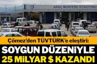 İYİ Parti Balıkesir Milletvekili Turhan Çömez, TBMM’de yaptığı konuşmada şirket hakkında binlerce şikayet olduğunu söyleyerek “Araç muayene özelleştirmesi 2007’de TÜVTÜRK’e 20 yıllığına 552 milyon dolara verildi. TÜVTÜRK bu dönemde tam 25 milyar dolar kazandı” açıklamasını yaptı.