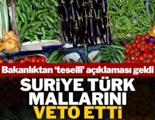 Suriye Kara ve Deniz Liman İdareleri Başkanlığı tarafından alınan karara göre; domates, salatalık, patates, kabak, patlıcan, biber, elma, üzüm, şeftali, kiraz, armut, karpuz, kavun, incir, kuru incir, sarımsak, yumurta ve tavuk eti ithalatı geçici olarak durduruldu.