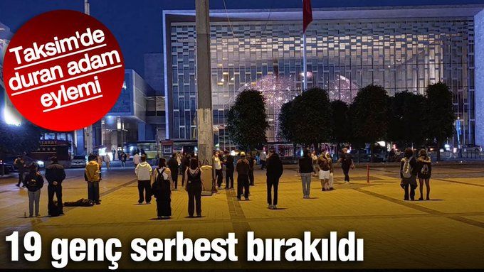 Taksim Meydanı’nda akşam saatlerinde bir araya gelen gençler, yüzlerini Atatürk Kültür Merkezi’ne (AKM) dönerek “Duran Adam” eylemi gerçekleştirdi. Polisin müdahalesiyle, aralarında 2 çocuğun da bulunduğu 21 kişi gözaltına alındı. Gözaltına alınanlar, sağlık kontrollerinin ardından ifadeleri alınmak üzere İstanbul İl Emniyet Müdürlüğü’ne götürüldü.