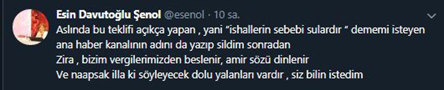Sularla ilişkili olduğunu söylemem. Aslında bu teklifi açıkça yapan, yani ‘ishallerin sebebi sulardır’ dememi isteyen ana haber kanalının adını da yazıp sildim sonradan. Zira, bizim vergilerimizden beslenir, amir sözü dinlenir. Ve ne yapsak illa ki söyleyecek dolu yalanları vardır, siz bilin istedim” ifadelerini kullandı.