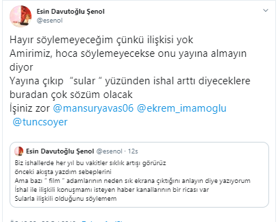 Şenol, “Biz ishallerde her yıl bu vakitler sıklık artışı görürüz. Önceki akışta yazdım sebeplerini ama bazı ‘film’ adamlarının neden sık ekrana çıktığını anlayın diye yazıyorum. İshal ile ilişkili konuşmamı isteyen haber kanallarının bir ricası var.