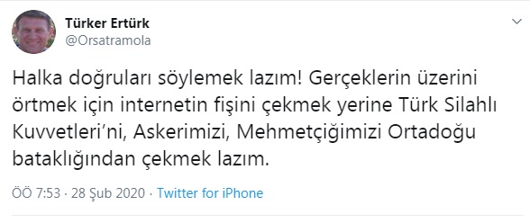 "Halka doğruları söylemek lazım! Gerçeklerin üzerini örtmek için internetin fişini çekmek yerine Türk Silahlı Kuvvetleri’ni, Askerimizi, Mehmetçiğimizi Ortadoğu bataklığından çekmek lazım."