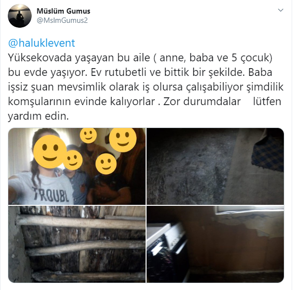 Yüksekovada yaşayan bu aile ( anne, baba ve 5 çocuk) bu evde yaşıyor. Ev rutubetli ve bittik bir şekilde. Baba işsiz şuan mevsimlik olarak iş olursa çalışabiliyor şimdilik komşularının evinde kalıyorlar . Zor durumdalar lütfen yardım edin.