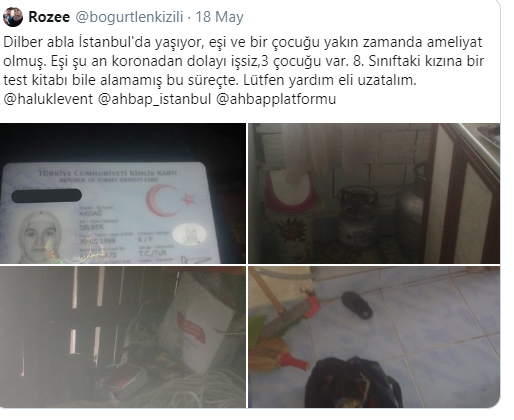 Dilber abla İstanbul'da yaşıyor, eşi ve bir çocuğu yakın zamanda ameliyat olmuş. Eşi şu an koronadan dolayı işsiz,3 çocuğu var. 8. Sınıftaki kızına bir test kitabı bile alamamış bu süreçte. Lütfen yardım eli uzatalım.