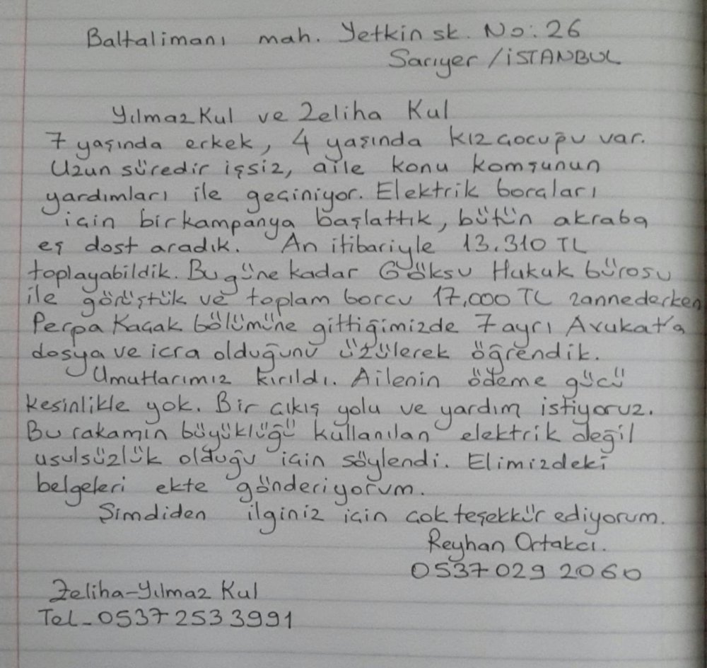 İstanbul Baltalimanı’nda bir aile dramı yaşanıyor. Yetkin Sokak No:26’da oturan iki çocuklu Yılmaz – Zaliha Kul ailesi maddi imkansızlıklar nedeniyle kaçak elektrik kullanınca fatura çığ gibi büyüdü ve icralarla boğuşmaya başladılar. Zaten zor şartlarda geçim müadelesi veren aileye yardım etmek isteyen mahalle sakinleri kendi aralarında 13.310 TL toplayarak faturayı ödemek istedi. Fakat güncel borcun katlanarak artıp 29.500 TL’ye çıktığını öğrenince mahalleli de yardım eli uzatabilmekte çaresiz kaldı.