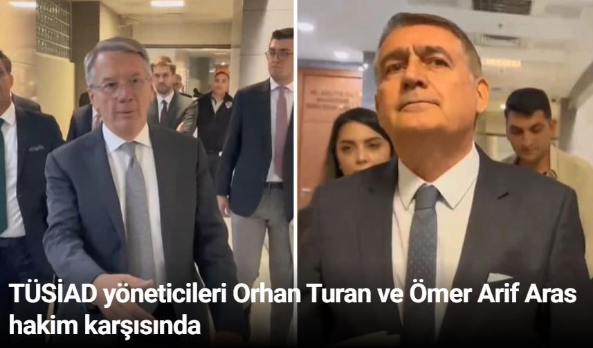 Türk Sanayicileri ve İş İnsanları Derneği (TÜSİAD) Başkanı Orhan Turan ve YİK Başkanı Ömer Arif Aras, 13 Şubat'ta dernek genel kurulunda yaptığı konuşması nedeniyle 'Yanıltıcı bilgiyi alenen yayma ve adil yargılamayı etkilemeye teşebbüs' suçlarından yargılandıkları davanın ilk duruşması için Çağlayan'daki İstanbul Adalet Sarayı'na geldi.