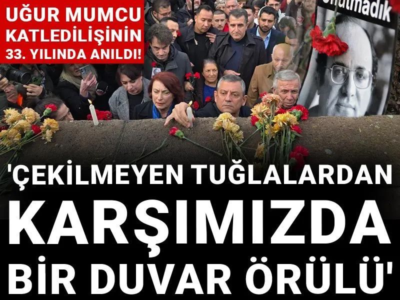 Gazeteci-Yazar Uğur Mumcu, 33 yıl önce katledildiği evinin önünde düzenlenen törenle anıldı. Törene CHP lideri Özgür Özel, Uğur Mumcu'nun eşi Güldal Mumcu, oğlu Özgür Mumcu, kızı Özge Mumcu Aybars, Ankara Büyükşehir Belediye (ABB) Başkanı Mansur Yavaş, Çankaya Belediye Başkanı Hüseyin Can Güner, Yenimahalle Belediye Başkanı Fethi Yaşar, Mamak Belediye Başkanı Veli Gündüz Şahin, Etimesgut Belediye Başkanı Erdal Beşikçioğlu yanı sıra CHP Genel Başkan Yardımcıları Gül Çiftci, Ulaş Karasu, Gamze Taşcıer, Aylın Nazlıaka ve bazı milletvekilleri ile yurttaşlar katıldı.