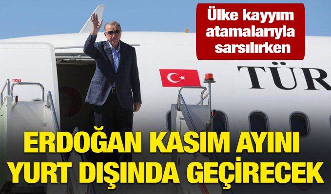 Türkiye, milli iradenin gaspı olarak nitelendirilen kayyım atamalarıyla sarsılırken, AKP'li Cumhurbaşkanı Recep Tayyip Erdoğan, 20 kasım tarihine kadar yurt dışında olacak. Erdoğan'ın bugün Kırgızistan ziyaretleriyle başlayacak gezileri 19 kasımda Rio'da son bulacak. Erdoğan'ın yokluğunda, Cumhurbaşkanlığına Cumhurbaşkanı yardımcısı Cevdet yılmaz vekalet edecek.