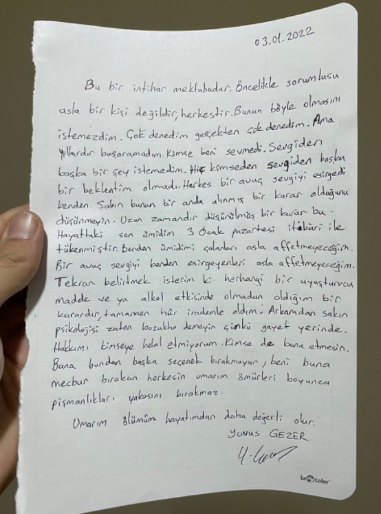 "Bu bir intihar mektubudur. Öncelikle sorumlusu asla bir kişi değildir, herkestir. Bunun böyle olmasını istemezdim. Çok denedim gerçekten çok denedim. Ama yıllardır başaramadım. Kimse beni sevmedi. Sevgiden başka bir şey istemedim. Hiç kimseden sevgiden başka bir beklentim olmadı. Herkes bir avuç sevgiyi esirgedi benden. Sakın bunun bir anda alınmış bir karar olduğunu düşünmeyin. Uzun zamandır düşünülmüş bir karar bu. Hayattaki son ümidim 3 Ocak Pazartesi itibari ile tükenmiştir. Benden ümidimi çalanları asla affetmeyeceğim. Bir avuç sevgiyi benden esirgeyenleri asla affetmeyeceğim. Tekrar belirtmek isterim ki herhangi bir uyuşturucu madde veya alkol etkisinde olmadan aldığım bir karardır, tamamen hür irademle aldım. Arkamdan sakın psikolojisi zaten bozuktu demeyin çünkü gayet yerinde. Hakkımı kimseye helal etmiyorum. Kimse de bana etmesin. Bana bundan başka seçenek bırakmayan, beni buna mecbur bırakan herkesin umarım ömürleri boyunca pişmanlıkları yakasını bırakmaz. Umarım ölümüm hayatımdan daha değerli olur.
