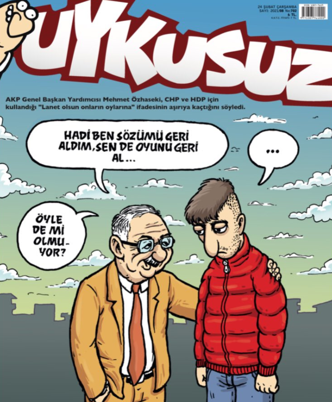 Haftalık mizah ve karikatür dergisi Uykusuz'un Özhaseki'nin Özhaseki'nin yer aldığı kapağı şöyle: