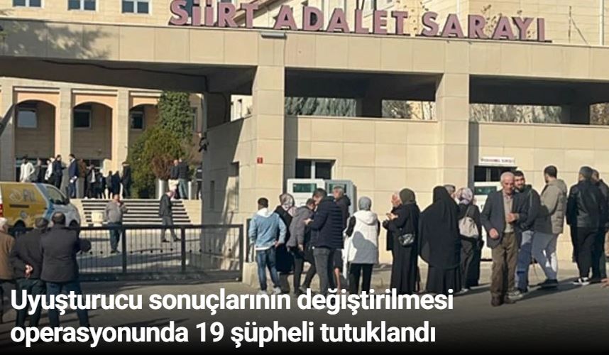 SİİRT Eğitim ve Araştırma Hastanesi’nde, uyuşturucu kullanan şüphelilerin tahlil sonuçlarının para karşılığında değiştirildiği iddiasına ilişkin başlatılan soruşturma kapsamında gözaltına alınıp, adliyeye sevk edilen 8’i sağlık çalışanı, 30 şüpheliden 19’u tutuklandı.