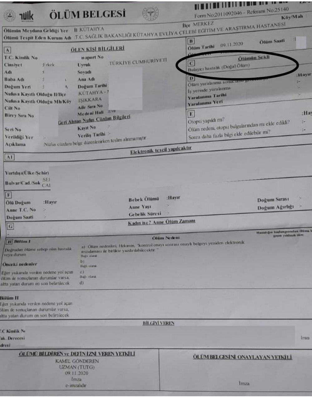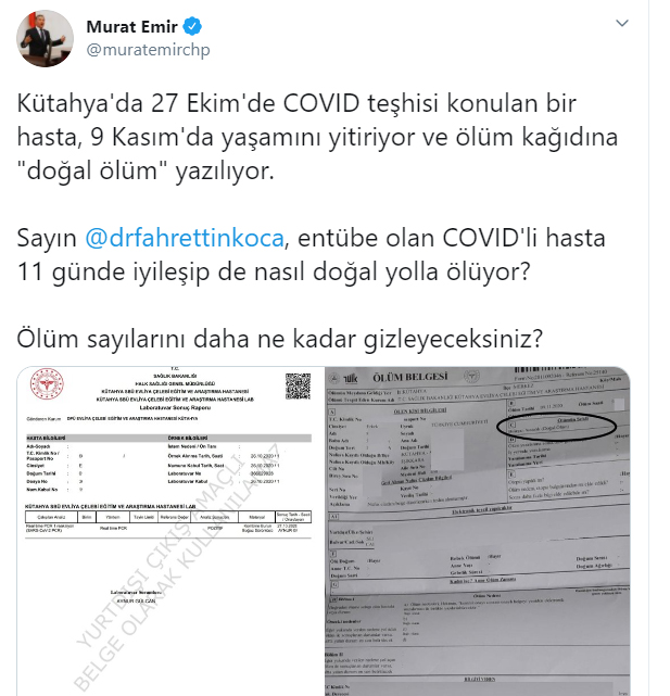 "Kütahya'da 27 Ekim'de COVID teşhisi konulan bir hasta, 9 Kasım'da yaşamını yitiriyor ve ölüm kağıdına "doğal ölüm" yazılıyor." bigisini veren Emir, Bakan Koca'ya, "entübe olan COVID'li hasta 11 günde iyileşip de nasıl doğal yolla ölüyor? Ölüm sayılarını daha ne kadar gizleyeceksiniz?" sorularını yöneltti.