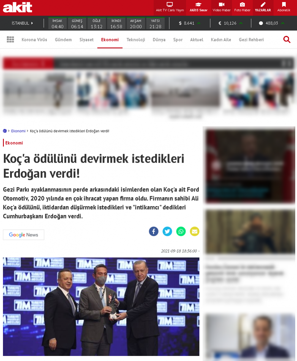 Skandal haberde, "Gezi Parkı ayaklanmasının perde arkasındaki isimlerden olan Koç'a ait Ford Otomotiv, 2020 yılında en çok ihracat yapan firma oldu. Firmanın sahibi Ali Koç'a ödülünü, iktidardan düşürmek istedikleri ve "intikamcı" dedikleri Cumhurbaşkanı Erdoğan verdi." sözlerine yer verirken Gezi Parkı sürecini hatırlatarak Ali Koç'u hedefe koydu.