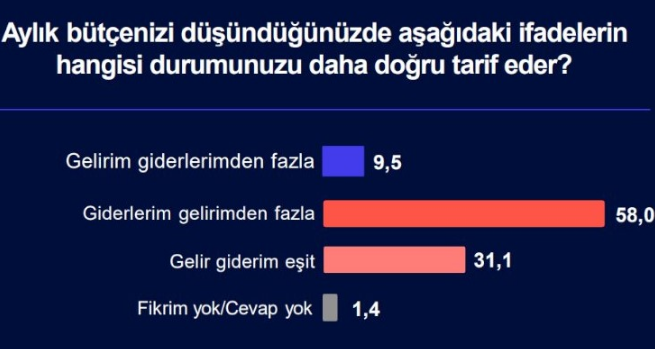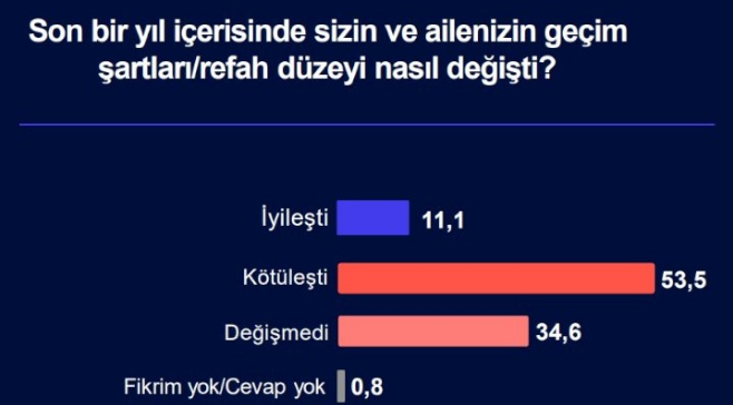 "Son bir yıl içerisinde sizin ve ailenizin geçim şartları/refah düzeyi nasıl değişti?" sorusuna toplumun yüzde 53.5’i kendisinin ve ailesinin refah düzeyinin son bir yıl içerisinde kötüleştiğini söyledi. Yüzde 11,1’i ise refah düzeyinin son bir yıl içerisinde iyileştiğini belirtti. Geçim şartlarında bir değişim olmadığını söyleyenlerin oranı yüzde yüzde 34,6 olurken 'fikrim yok' diyenlerin oranı yüzde 0.8 oldu.