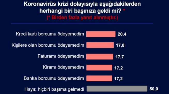 Koronavirüsle beraber ekonomik koşulların daha da kötüyleşmesi nedeniyle seçmenlerin yarısı en az bir tür borç ödemesinde zorluk çektiklerini belirtti.Kredi kartı borcunu ödeyemeyenlerin oranı yüzde 20,4 ve banka borcunu ödeyemeyenlerin oranı yüzde 17,2 oldu. Seçmenin yüzde 17,7’si faturalarını, yüzde 17,2’si de kirasını ödeyemediğini söyledi. Kişilere olan borcunu ödeyemeyen kesim ise yüzde 17,8 oldu.