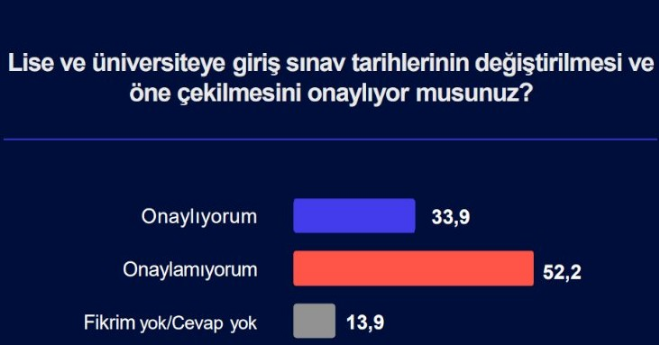Koronavirüs krizi nedeniyle lise ve üniversiteye giriş sınavı tarihlerinde yapılan değişiklikler sorulduğunda ise tarihlerin değiştirilmesini ve öne çekilmesini onaylamayanların oranı yüzde 52,2 oldu. Yüzde 33,9'luk kesim ise bu değişiklikleri onayladığını belirtti.
