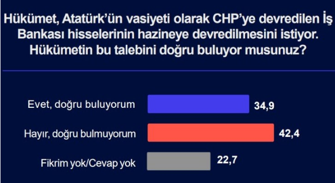Katılımcılara sorulan "Hükümet, Atatürk’ün vasiyeti olarak CHP’ye devredilen İş Bankası hisselerinin hazineye devredilmesini istiyor. Hükümetin bu talebini doğru buluyor musunuz?" sorusuna yüzde 42,4 "Doğru bulmuyorum" yanıtını verdi. Yüzde 34,9 ise devri doğru bulduğunu söyledi.