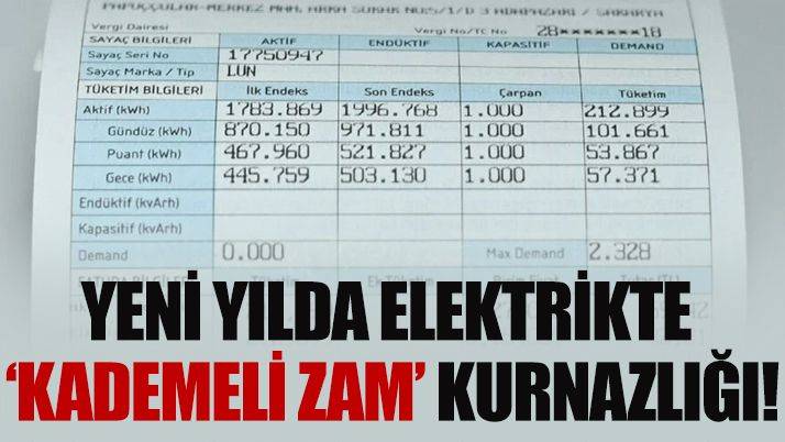“Akaryakıt zamları yetmezmiş gibi şimdi kademeli tarife üzerinden elektrikte faturalarına da bir zam hazırlığı yapılıyor. Türkiye'de dört kişilik bir hanenin asgari elektrik tüketimi 230 kilovatsaat olarak kabul edilirken; EPDK yetkilileri tarafından ilk kademenin 150 kilovatsaat olacağı yönünde açıklamalar yapılıyor.