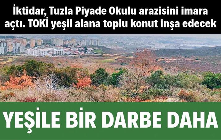 İKTİDAR, yeşil alanları beton yığını haline getirmeye doymuyor. 15 Temmuz 2016 darbe girişiminin ardından kent dışına taşınarak yeşil alan olacağı açıklanan askeri alanlardan biri daha inşaata açıldı. TOKİ ve MSB arasında 2024’te imzalanan protokolle Tuzla Aydınlı Mahallesi Piyade Okulu Komutanlığı’nda yer alan 1 milyon 846 bin metrekarelik alan “Rezerv Yapı Alanı” ilan edildi, ardından imar planları değiştirildi.