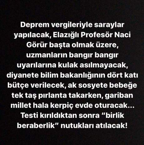 “Deprem vergileriyle saraylar yapılacak, Elazığlı Profesör Naci Görür başta olmak üzere, uzmanların bangır bangır uyarılarına kulak asılmayacak, diyanete bilim bakanlığının dört katı bütçe verilecek, ak sosyete bebeğe tek taş pırlanta takarken, gariban millet hâlâ kerpiç evde oturacak… Testi kırıldıktan sonra “birlik beraberlik” nutukları atılacak!”