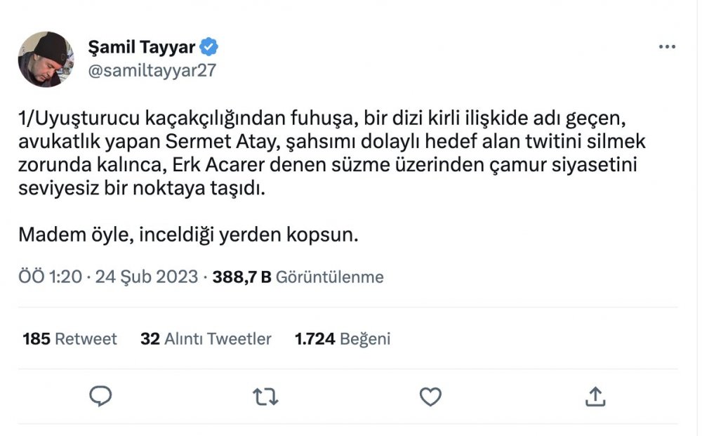 Tayyar'ın daha sonra bu tweeti sildiği ortaya çıktı.
