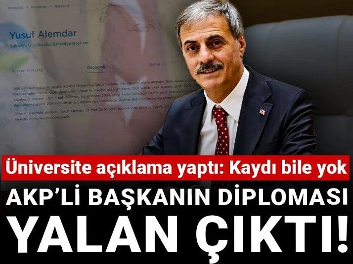 AKP Sakarya Büyükşehir Belediye Başkanı Yusuf Alemdar’ın, mezun olduğunu ifade ettiği Doğu Akdeniz Üniversitesi’nden mezun olmadığı açığa çıktı. Alemdar’ın biyografisinde, söz konusu üniversiteden mezun olduğu ifade edilirken Doğu Akdeniz Üniversitesi’nden yapılan açıklamada, Alemdar’ın üniversiteye hiç kayıt yaptırmadığı ve diploma kaydının olmadığı belirtildi.