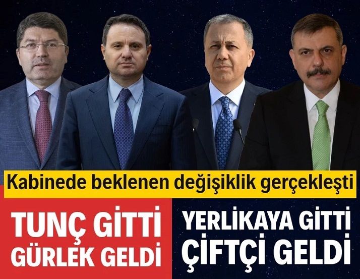 Resmi Gazete yayımlandı. Aylardır kulislerde bahsedilen kabine değişikliği gerçekleşti. Erdoğan'ın imzasıyla yayınlanan karara göre İçişleri Bakanı Ali Yerlikaya ve Adalet Bakanı Yılmaz Tunç görevden alındı.